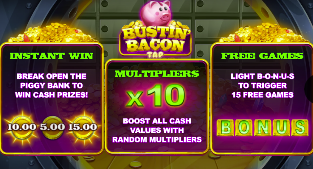 Get ready to tap for treasure in Bustin' Bacon Tap, an interactive slot focused on a simple yet addictive mechanic: smashing piggy banks. This game combines a straightforward slot base with a highly engaging bonus round where your taps directly translate to cash prizes and multipliers. Its a perfect blend of chance and light physical interaction, offering a fun and potentially rewarding break from standard slot play.